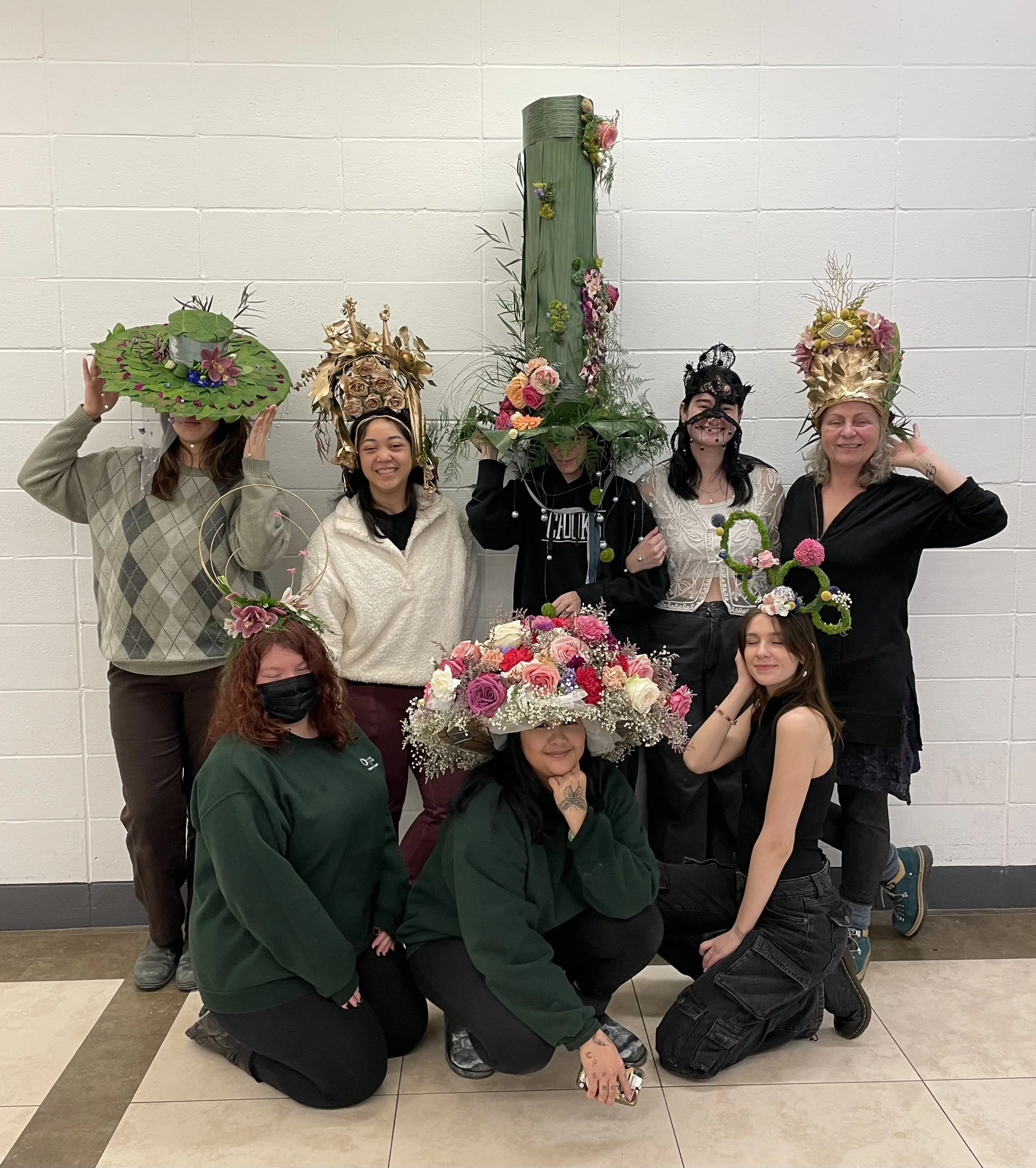 Moi et mes copinettes de classe durant notre projet de parure florale en Fleuristerie à l’École des métiers de l’horticulture de Montréal.